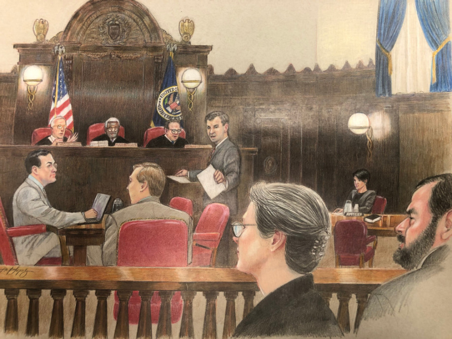 A sketch artist rendition of the scene from oral arguments before the Fifth Circuit Court of Appeals on September 3, 2019, in New Orleans. Pictured top, left to right, Judge Rhesa H. Barksdale, Chief Judge Carl E. Stewart, Judge Greg J. Costa; center, Michael Minns, Lead Attorney for Appellant; left Seth Kretzer, Attorney for Appellant; Matthew Faulks, Attorney for Amicus Curiae Idaho State Rifle and Pistol Association; far right, Katie Sue Bagley, United States Department of Justice, Tax Division; bottom right, Rep. John O. Green, Appellant.